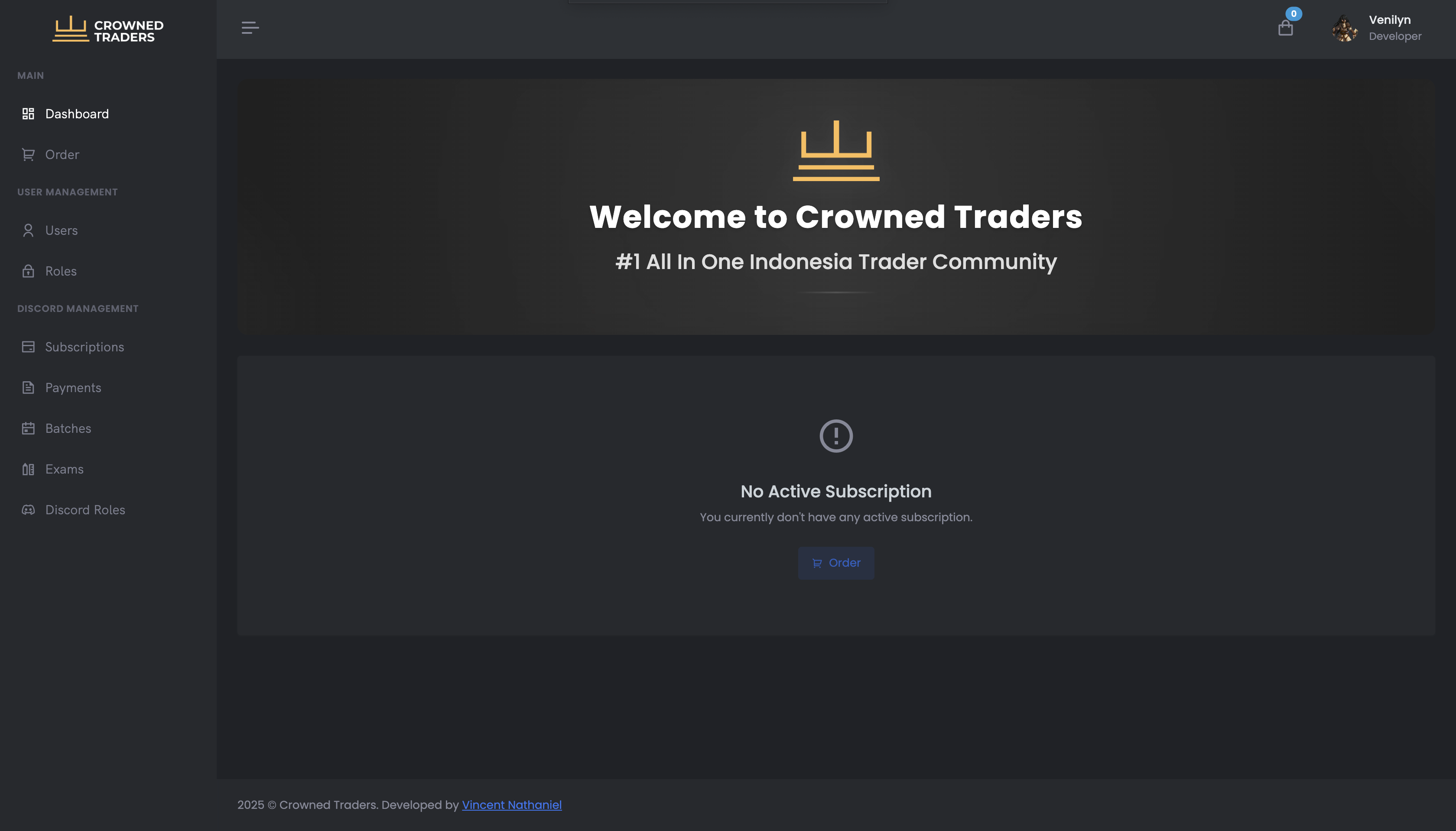 Crowned Traders Membership is a platform for managing Discord community memberships, integrated with a Discord bot and Midtrans, enabling users to purchase roles and automatically revoke access when their subscription period ends.