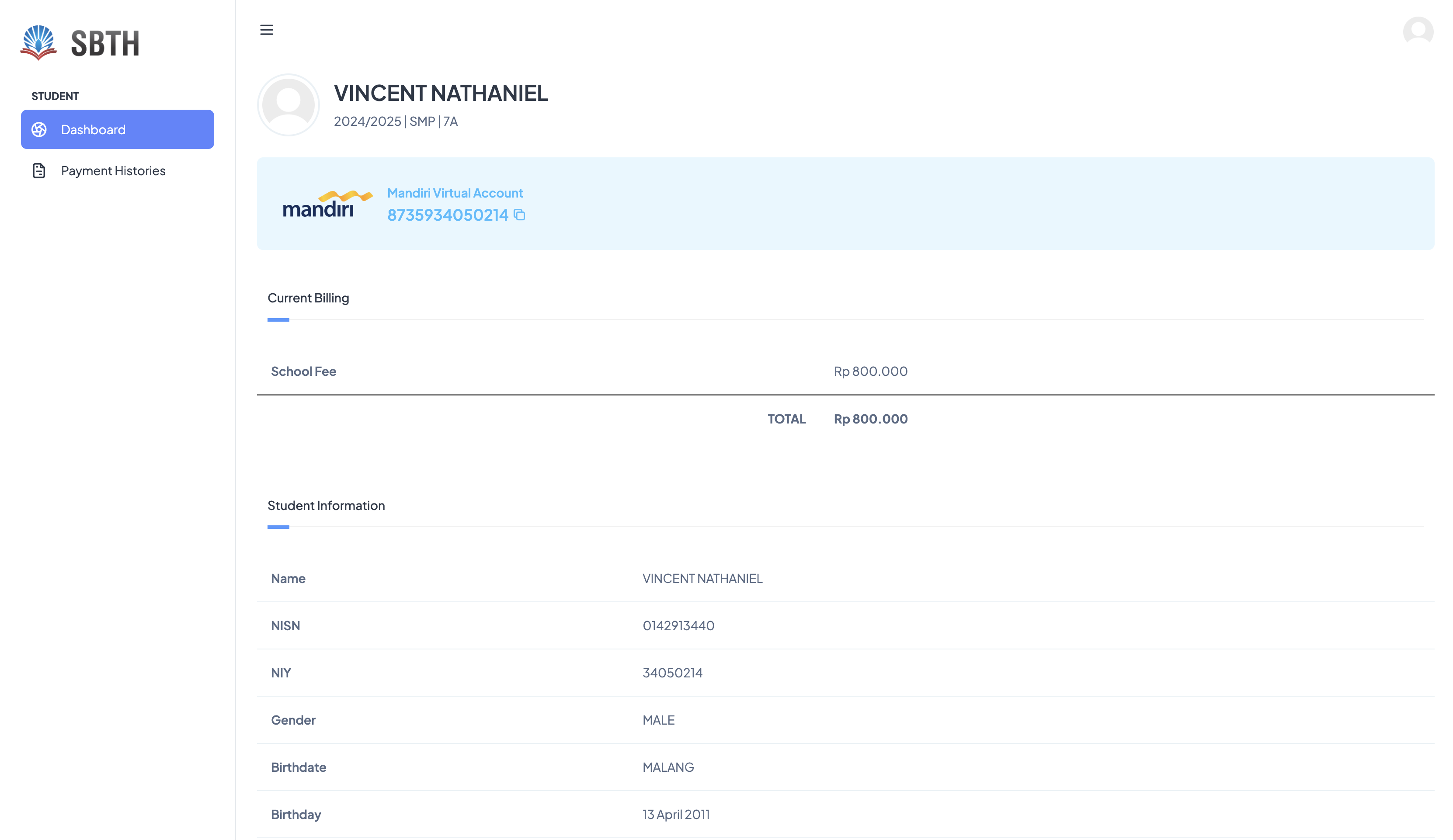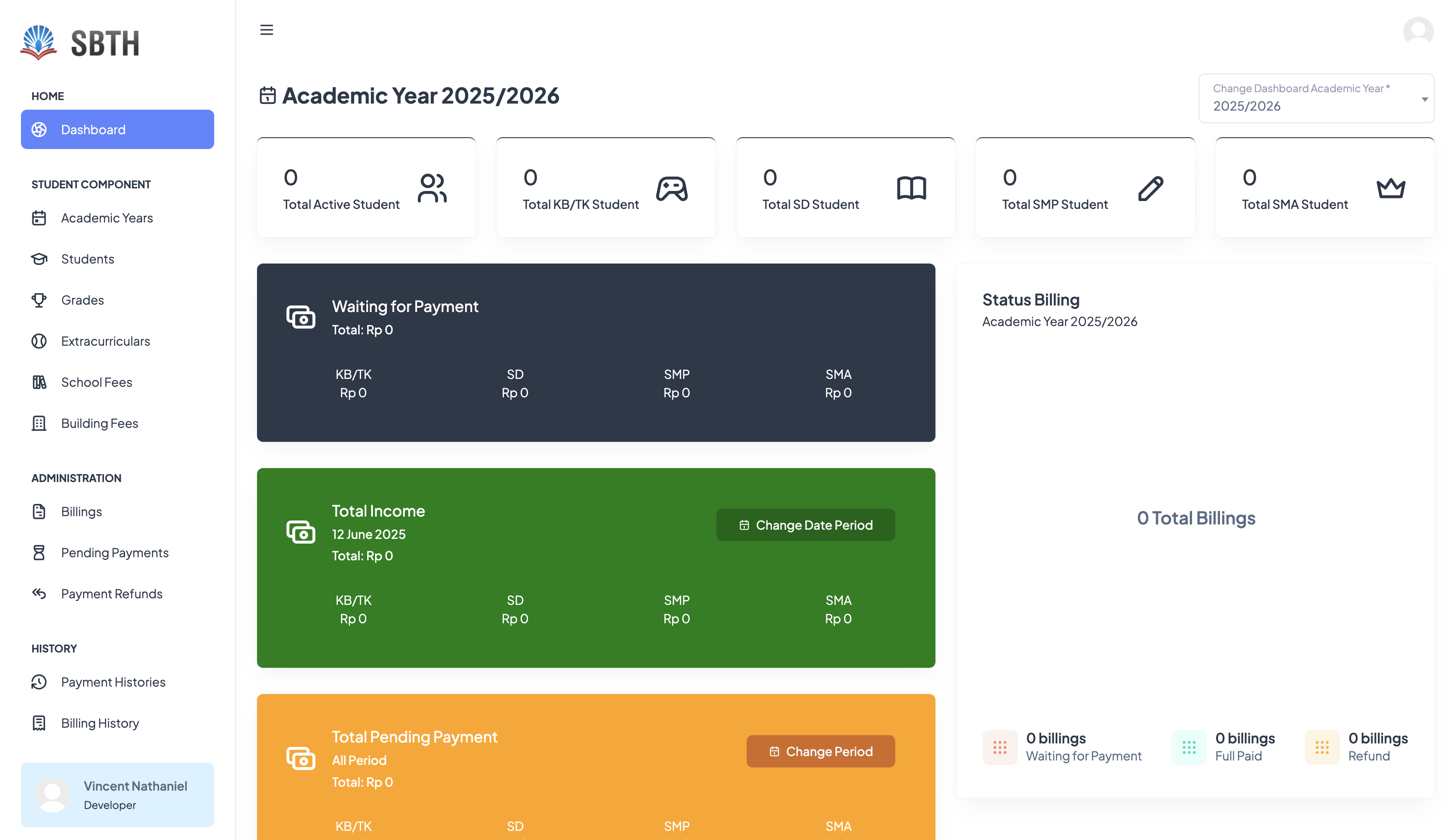 A system for managing school fees at SBTH, integrated with Bank Mandiri, handling school fees, building fees, and extracurricular charges, while also recording students’ classes and extracurricular activities for comprehensive school administration.