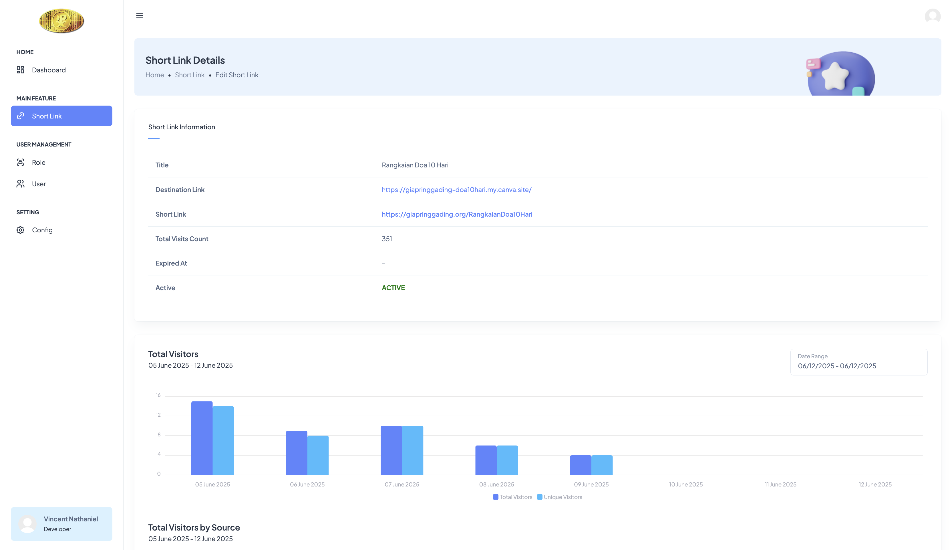 A custom shortlink system for GIA Pringgading with QR code generation, detailed visitor analytics including total and unique visitors, platform tracking, and comprehensive charts to monitor link performance across both direct and QR code access.