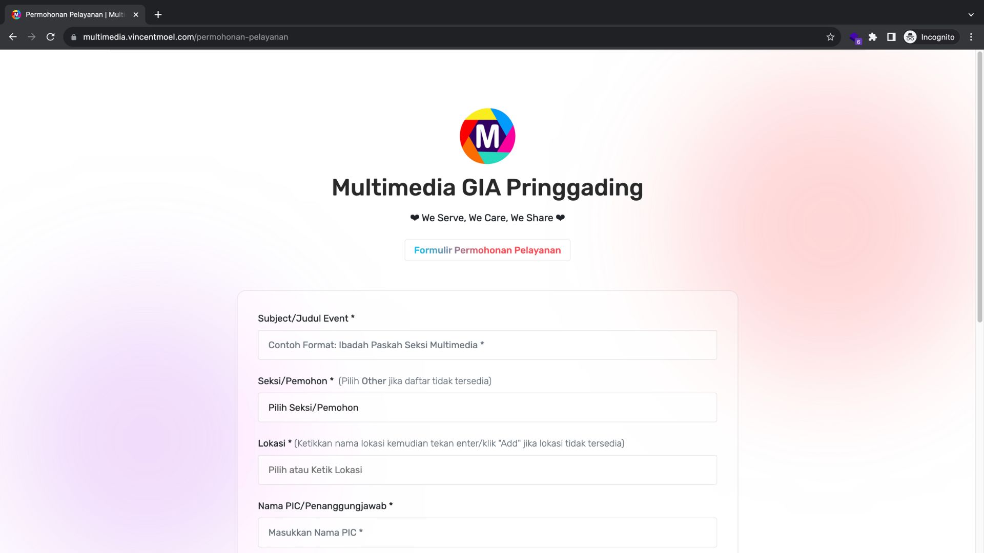 This system is utilized by the Multimedia Division at Gereja Isa Almasih Jemaat Pringgading, Semarang. The purpose of this application is to facilitate Multimedia Division members in serving the Division or congregation that requires services from the Multimedia Division by filling out the provided forms.