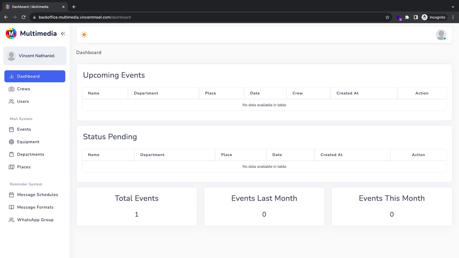 This application is used to manage service requests from the website https://multimedia.vincentmoel.com. Additionally, the application can be utilized to automatically send messages to WhatsApp as event reminders or notifications to the team on duty.