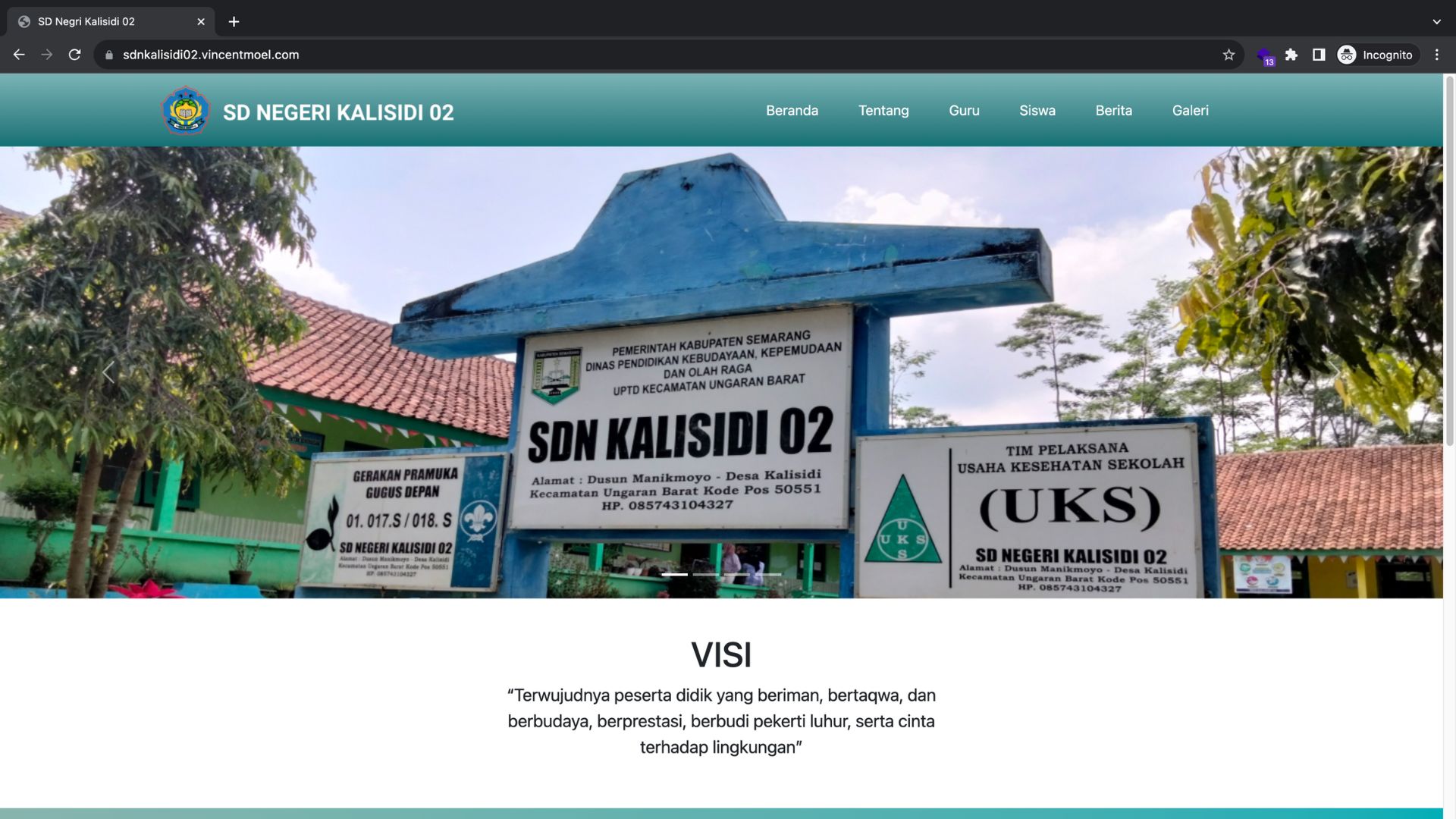 This website contains the profile of SDN Kalisidi 02 school. The available features include Admin Login, CMS (Content Management System), Gallery, News, List of Teachers, List of Students, and more.